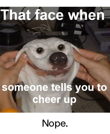Oh? Cheer up, you say? By jolly. I’M CURED. So this approach definitely doesn’t work (no shit). Emotions are not just something you can turn on and off like a faucet unless you are an actual sociopath. It’s ok for people not to be happy all the time. In fact, it’s human. Remind them that they’re not alone and that you’ve got their back.