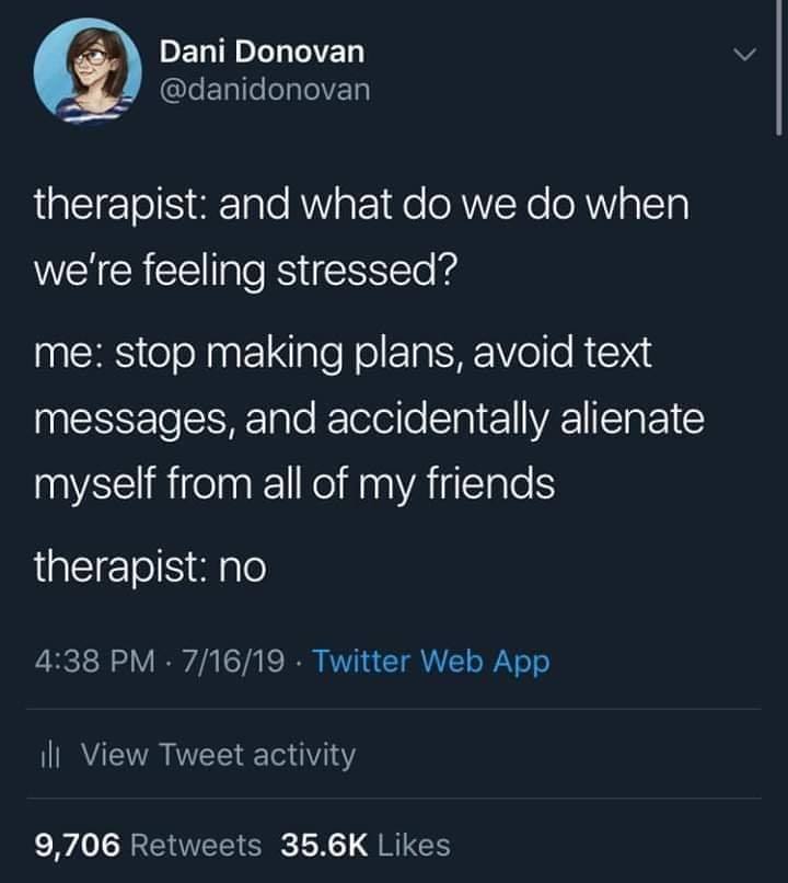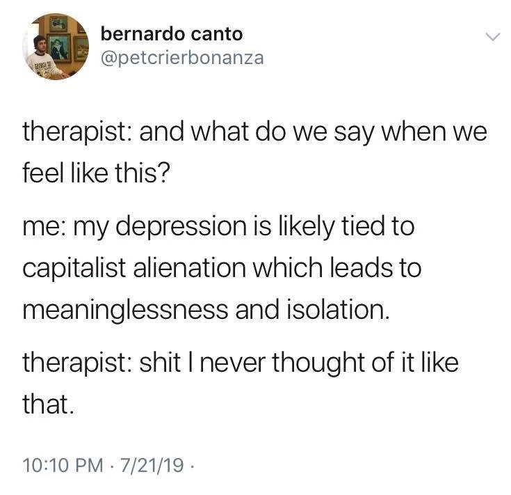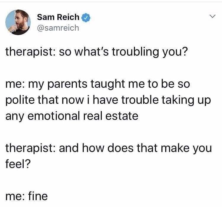 Unless you’re living under a meme-rock, you’ve probably seen the latest trend of folks sharing some amusing interactions between themselves & their “therapists”. We love how interactions in the therapy room (however embellished) are hitting the mainstream and shaking up the stigma of getting help and seeing a therapist.